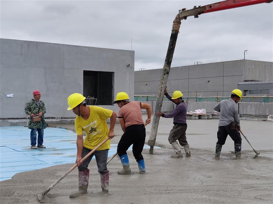 項(xiàng)目部全體成員以只爭(zhēng)朝夕的精神狀態(tài)、沖刺的姿態(tài),堅(jiān)決完成施工任務(wù)。目前,該項(xiàng)目消防工程完成施工合同80%,外墻氟碳漆完成施工合同80%,樓面施工完成施工合同80%。雙節(jié)期間搶工,完成樓面3200平方米地坪混凝土澆筑,外墻膩?zhàn)哟虻?500平方米。