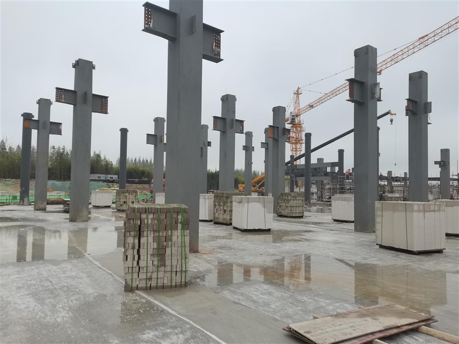 項(xiàng)目所在地受疫情影響較大,為統(tǒng)籌抓好項(xiàng)目疫情防控、安全生產(chǎn)、施工進(jìn)度等工作,項(xiàng)目部嚴(yán)格落實(shí)疫情常態(tài)化防控措施,做好日常測(cè)體溫、消毒等工作,并對(duì)項(xiàng)目進(jìn)行統(tǒng)籌規(guī)劃,根據(jù)“白+黑”“晴+雨”的天氣情況,合理安排相應(yīng)的施工任務(wù),同時(shí)加強(qiáng)吊裝機(jī)械設(shè)備的排班策劃力度,合理安排穿插作業(yè),確保工程進(jìn)度如期完成。經(jīng)過(guò)兩個(gè)月的施工,目前項(xiàng)目正在進(jìn)行第一層鋼梁安裝焊接和砌體結(jié)構(gòu)砌筑、二層鋼柱吊裝安裝等工序。