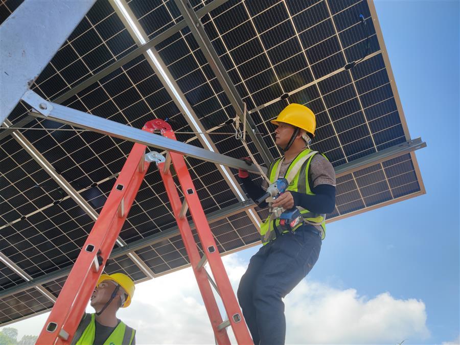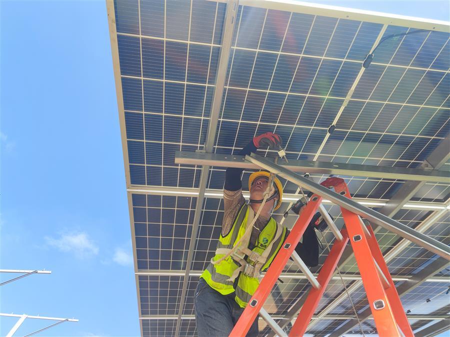 “我們戰(zhàn)高溫斗酷暑,搶工期、趕進度,確保如期實現(xiàn)并網(wǎng)發(fā)電?!币苯ɑA(chǔ)分公司寧明縣寨安光伏項目建設(shè)工程項目負責(zé)人李世文說,施工現(xiàn)場在山坡上,遮陽的地方少,光伏板和支架被太陽炙烤得發(fā)燙,施工人員咬緊牙關(guān)克服困難,堅守在工作一線。每天150余名施工人員輪流作業(yè),15臺機械設(shè)備晝夜運轉(zhuǎn),1500多畝的項目現(xiàn)場,一根根樁基豎起、一座座支架矗立,山坡上遍布光伏板。