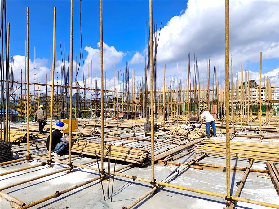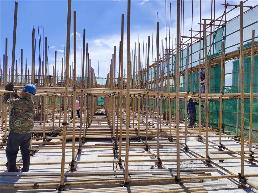 在項目現(xiàn)場,每天有50多名工人頂著高溫,相互配合,有條不紊地進行鋼筋加工、綁扎鋼筋、混凝土澆筑等工作。為了趕工期,他們時常加班加點工作到深夜,同時還認真按照工藝標準逐條逐項落實每一項細節(jié),嚴把工藝質(zhì)量。