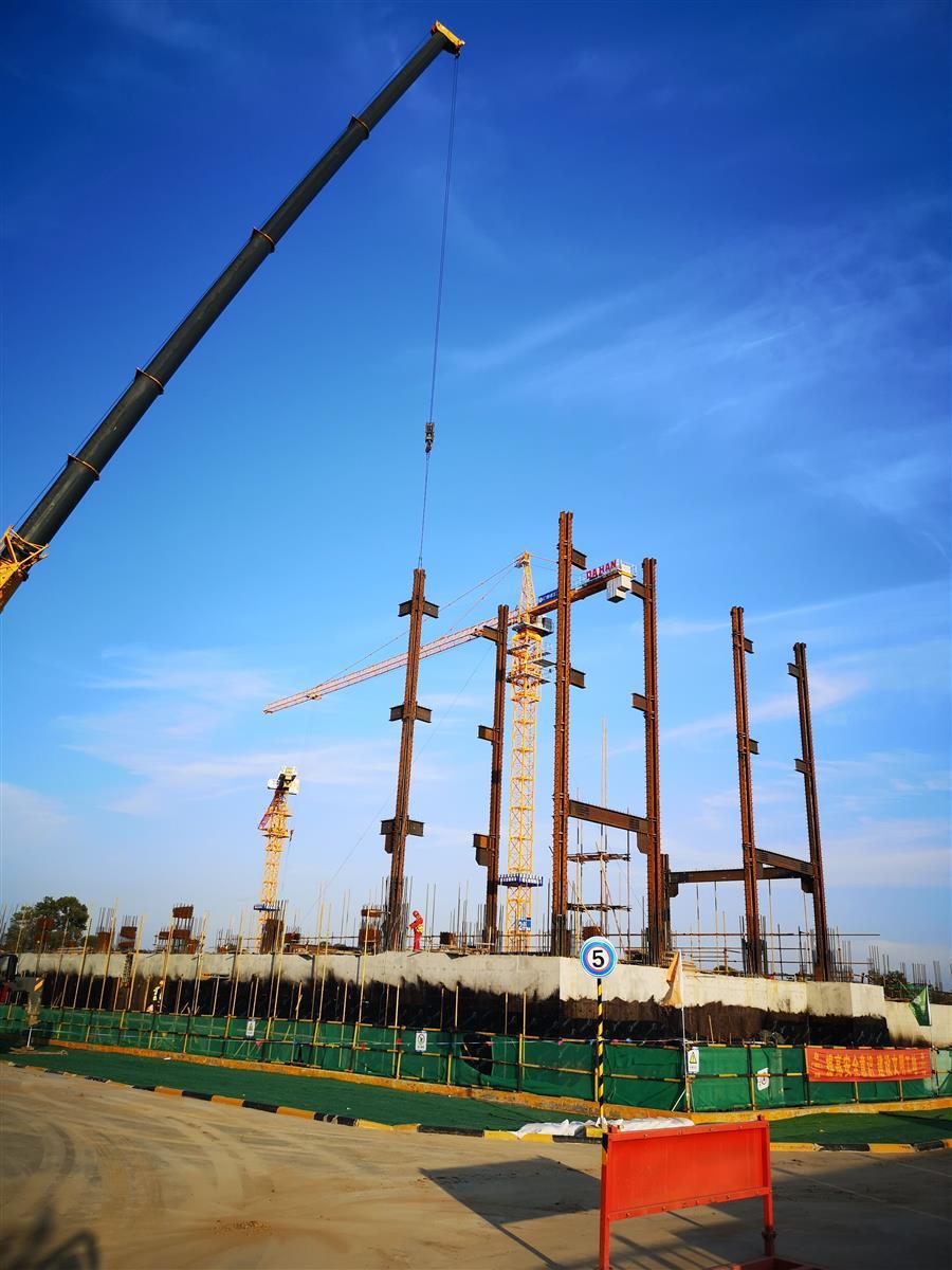 目前,項目正在進行主體施工,施工現(xiàn)場正緊張有序地進行著模板安裝、鋼筋綁扎、水電管線預埋、鋼結(jié)構(gòu)吊裝等工作。