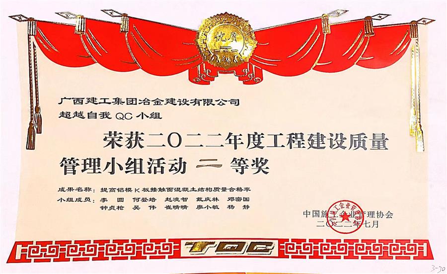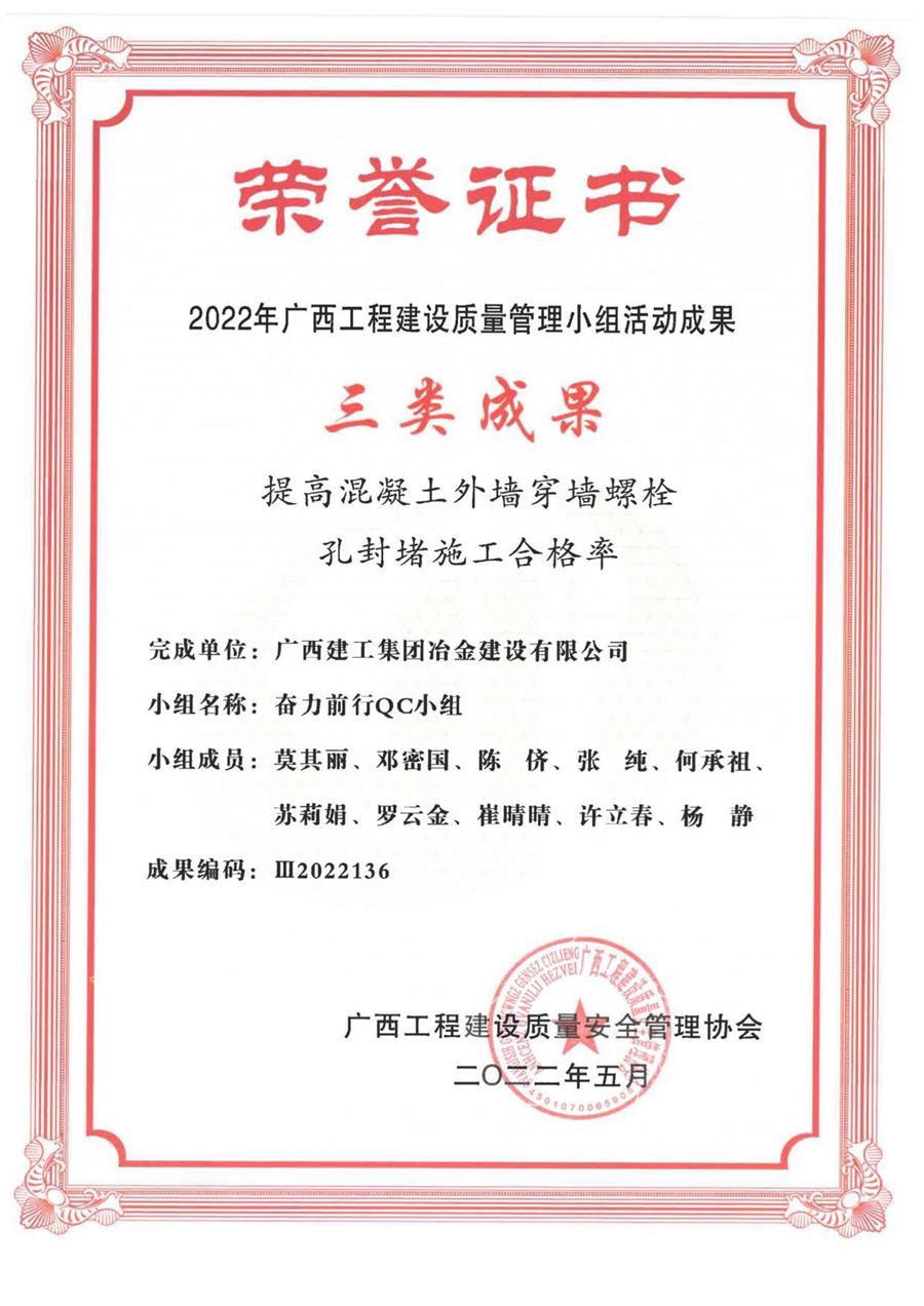 《提高預(yù)制混凝土箱涵頂進(jìn)軸線偏差合格率》《提高混凝土外墻穿墻螺栓孔封堵施工合格率》榮獲2022年廣西工程建設(shè)質(zhì)量管理小組活動(dòng)成果三類成果。