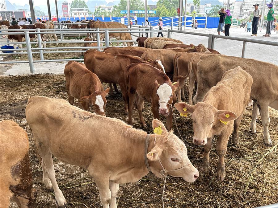活動(dòng)現(xiàn)場(chǎng),熱鬧非凡,大家參觀了農(nóng)特項(xiàng)目園區(qū)及桂中牛行,并對(duì)園區(qū)今后的發(fā)展提出了意見和建議。桂中牛行作為農(nóng)特項(xiàng)目園區(qū)內(nèi)的首個(gè)主力商家,主營活牛羊交易,副營馬、驢、騾子等草食動(dòng)物交易。試業(yè)當(dāng)天,牛群“哞哞”聲此起彼伏,一頭頭體格健壯的牛兒一字排開,人們?nèi)宄扇旱貒墼谝黄?,仔?xì)挑選著心儀的牛兒。一旁的牛崽交易市場(chǎng)內(nèi),買家更是爭(zhēng)相搶購體態(tài)良好的牛崽,市場(chǎng)交易紅火。