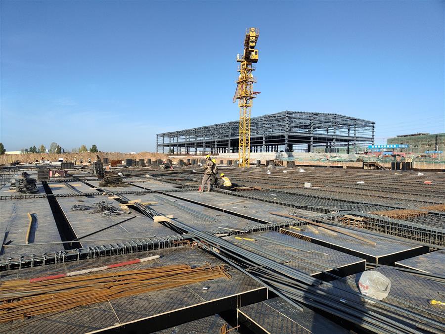 融安縣生活垃圾焚燒發(fā)電項目工程總承包項目,工人正在進行汽機間屋面鋼筋網(wǎng)綁扎。