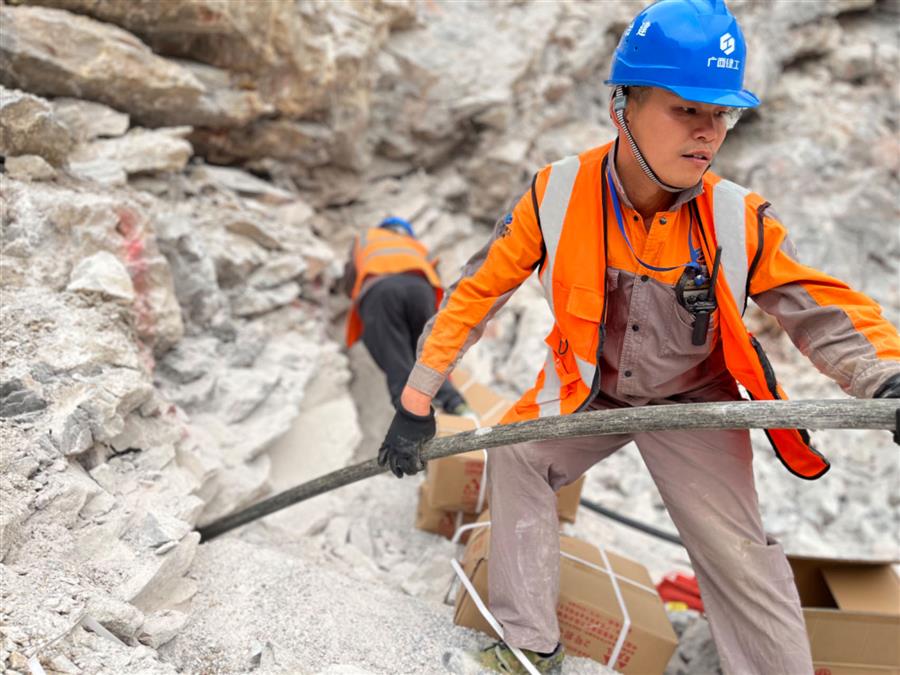 柳州市柳北區(qū)石碑坪古木村石灰?guī)r礦爆破工程,爆破作業(yè)人員正在進行裝藥、網(wǎng)絡延時設置等作業(yè)。
