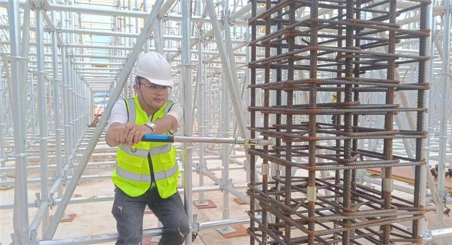 鹿寨智慧林業(yè)零碳循環(huán)產(chǎn)業(yè)園項目,管理人員正在進行鋼筋套筒扭矩測試。