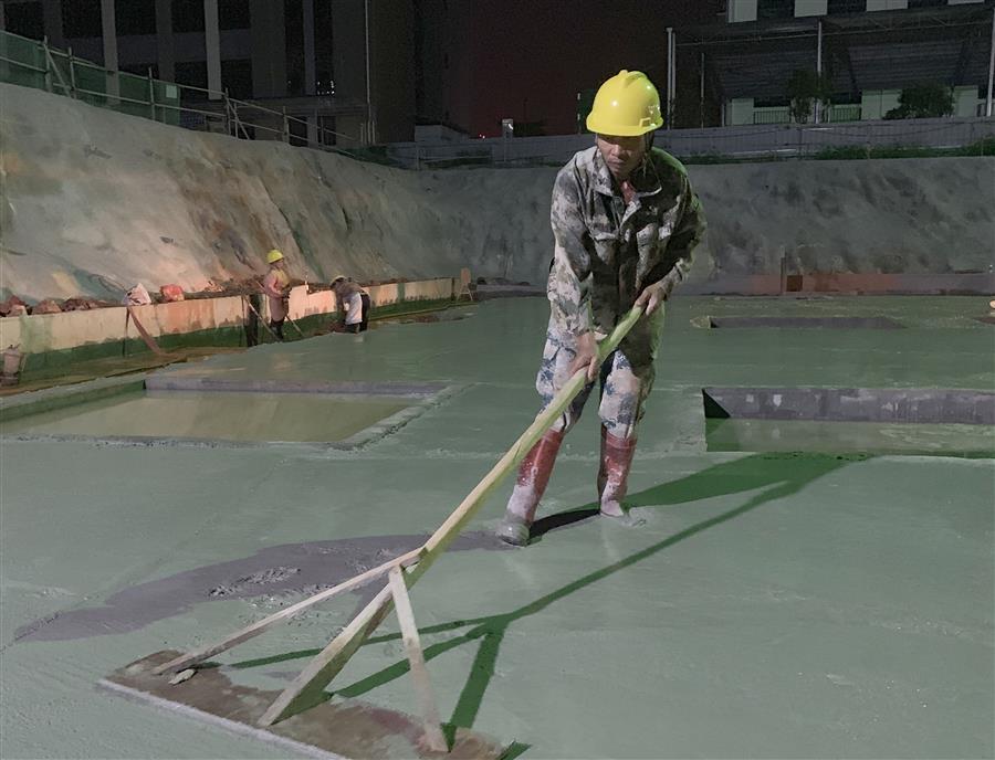 河池羅城供電局本部技術業(yè)務用房項目,工人加班進行基礎抗水板墊層澆筑。