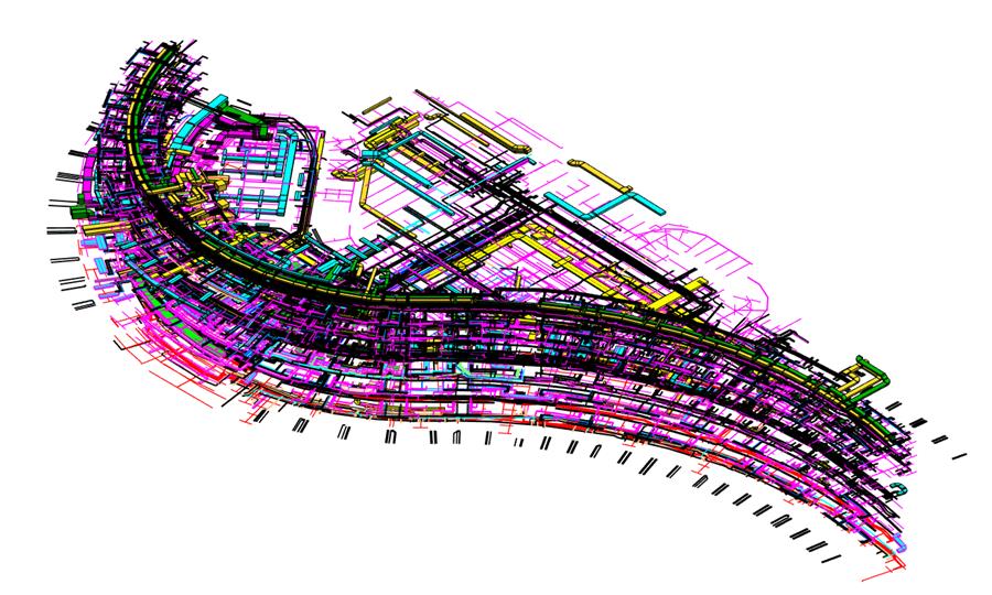 其中BIM機(jī)電深化設(shè)計(jì)為項(xiàng)目帶來了巨大的經(jīng)濟(jì)效益。通過建立BIM模型,在模型中進(jìn)行管線綜合排布、凈高優(yōu)化、機(jī)房深化設(shè)計(jì)等,發(fā)現(xiàn)并解決設(shè)計(jì)圖紙中存在的錯(cuò)誤,然后進(jìn)行碰撞檢查,優(yōu)化管線走向,提高樓層凈高,最終導(dǎo)出深化后的BIM模型與CAD圖紙,兩者相結(jié)合對現(xiàn)場施工人員進(jìn)行交底,指導(dǎo)現(xiàn)場施工。