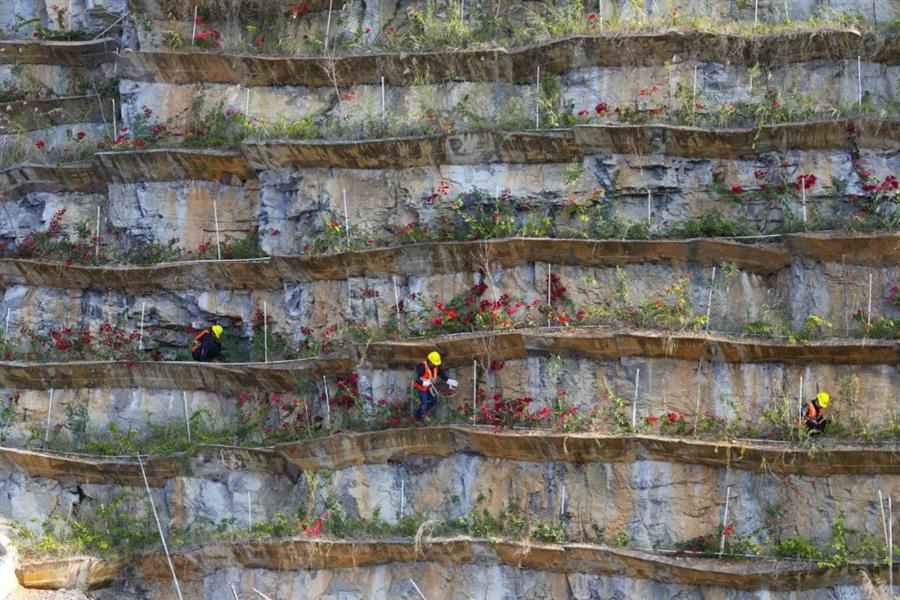 “我們已經(jīng)在山上種下了25萬多株各類苗木。工程項目經(jīng)理陳超宇說,工人們需要先清理有滾落危險的巖石,然后用鋼筋和混凝土在峭壁上搭建V型板槽,再給開辟出來的梯田回填泥土,并在田間鋪設(shè)噴淋系統(tǒng),最后才能進(jìn)行種植。目前種植的苗木有石山紫薇、夾竹桃、石山榕、爬山虎、三角梅、杜鵑等。