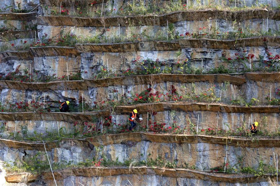 2021年12月19日,工人在樓梯山的峭壁上養(yǎng)護綠植。