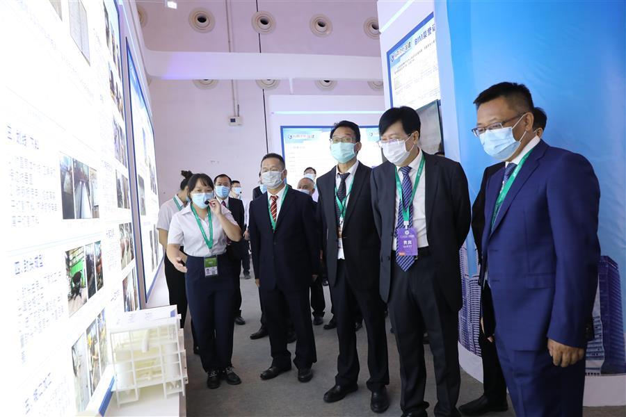 集團(tuán)公司總經(jīng)理、黨委副書記、董事羅濤(右二),海南省住建廳副廳長劉聯(lián)偉(右一)在冶建公司展區(qū)參觀
