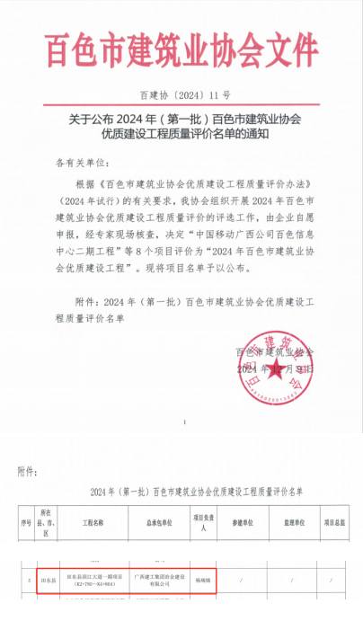 近日,百色市建筑業(yè)協(xié)會公布表彰決定,由冶建公司桂鴻分公司承建的田東縣濱江大道一期項目(K2+780~K4+864)獲評為“2024 年百色市建筑業(yè)協(xié)會優(yōu)質建設工程”。