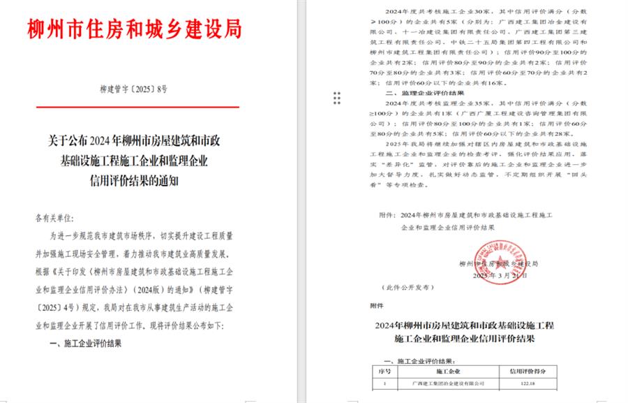 近日,柳州市住房和城鄉(xiāng)建設(shè)局發(fā)布《關(guān)于公布2024年柳州市房屋建筑和市政基礎(chǔ)設(shè)施工程施工企業(yè)和監(jiān)理企業(yè)信用評(píng)價(jià)結(jié)果的通知》(柳建管字〔2025〕8號(hào)),冶建公司以122.18分的優(yōu)異成績,位列柳州市施工企業(yè)信用評(píng)價(jià)榜首,彰顯了公司在工程質(zhì)量、安全管理及市場信譽(yù)等方面的卓越實(shí)力。