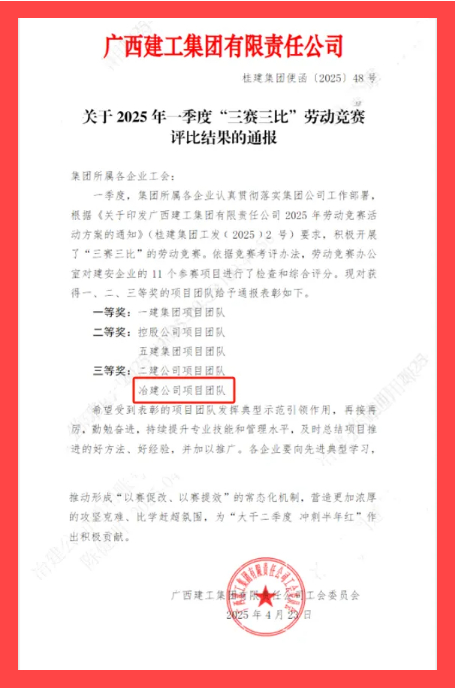 4月23日,集團(tuán)公司工會(huì)通報(bào)2025年一季度“三賽三比”勞動(dòng)競賽評(píng)比結(jié)果,冶建公司項(xiàng)目團(tuán)隊(duì)在11個(gè)建安企業(yè)參賽項(xiàng)目中榮獲三等獎(jiǎng),彰顯了項(xiàng)目團(tuán)隊(duì)務(wù)實(shí)高效、團(tuán)結(jié)協(xié)作、拼搏進(jìn)取的精神風(fēng)貌。
