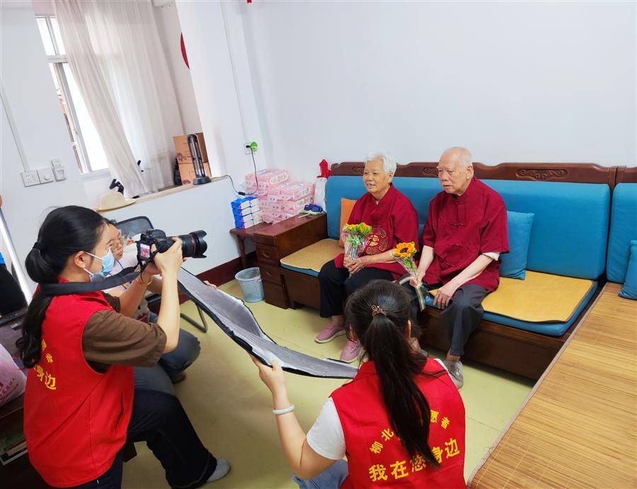 “我們結(jié)婚近七十年了,這張照片很珍貴,我要放在客廳最顯眼的地方?!表f爺爺捧著照片笑容滿面地說道。他的老伴也說道:“孩子們常年在外工作,你們來看望我們又給我們拍照,心里特別暖。”